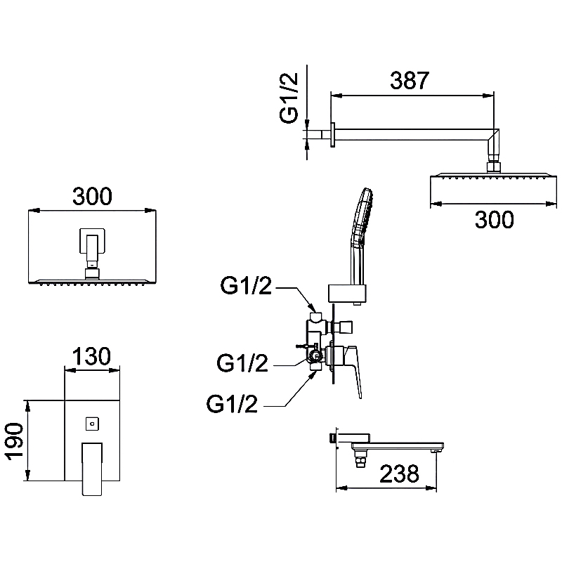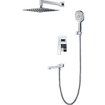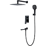 | Комплектация | верхний душ, держатель для душевой лейки, душевая лейка, душевой шланг, излив, кронштейн, наружная часть смесителя, смеситель, шланговое подключение |