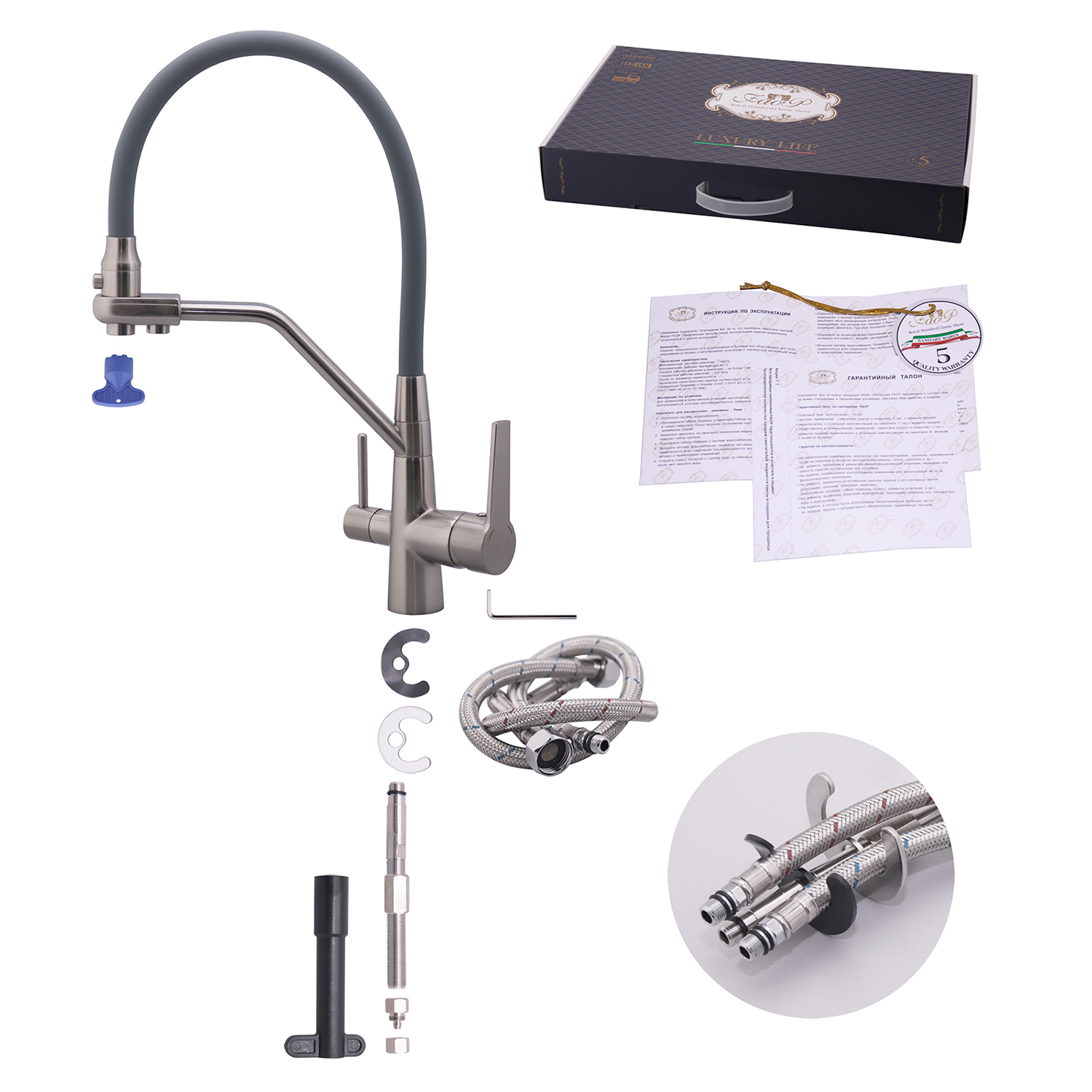 Комплектация товара Смеситель для кухни с гибким изливом FAOP A4397-5 зависит от конкретной поставки и может меняться поставщиком без предварительного уведомления!